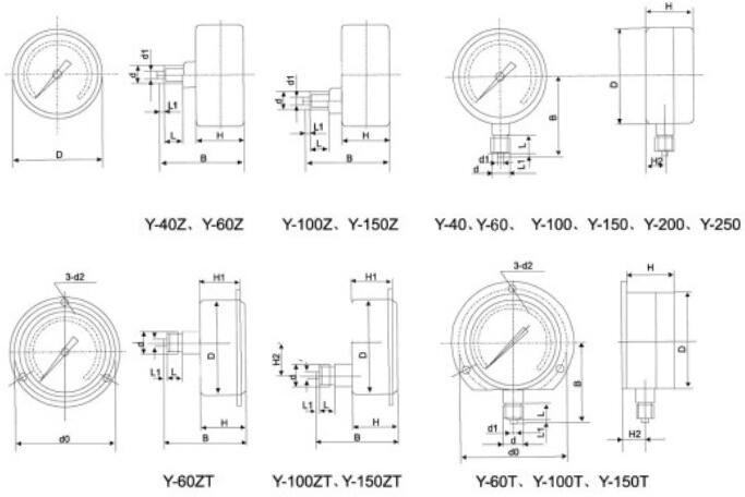 壓力表表盤直徑(mm):φ40 φ50 φ60 φ100 φ150 φ200 φ250